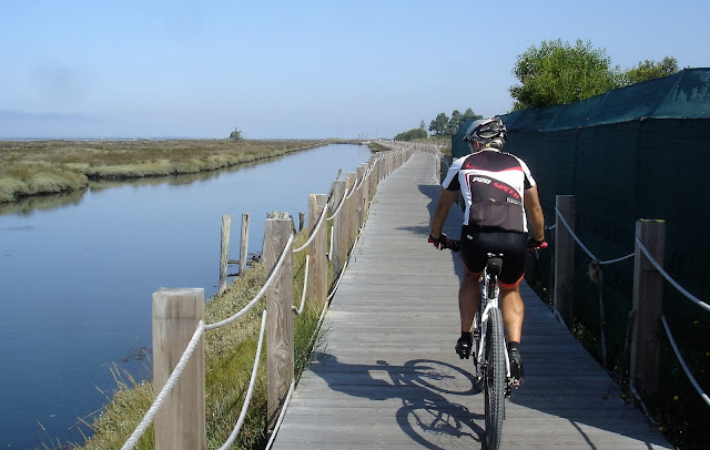 Por enquanto temos que nos contentar com os cerca de 7 Km, disponíveis entre o Cais de S. Roque, mesmo no centro da cidade, e a aldeia de Vilarinho, num percurso feito, maioritariamente, em passadeira de madeira, assente em estacaria, ao longo da Ria, incluindo ainda alguns troços em terra batida, que se viriam a revelar extremamente aprazíveis, onde não vão faltando estruturas de apoio, tais como bares\esplanadas, ainda que explorados por privados e onde chegaríamos pelas 11,00 horas, depois de resolvido um pequeno percalço no pneu traseiro da minha bicicleta.
